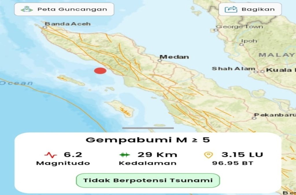 BNEWS.ID, Aceh – Gempa bumi berkekuatan 6,2 magnitudo mengguncang wilayah Aceh pada Jumat (31/1/2025) pukul 18.03 WIB. Guncangan kuat ini dirasakan di berbagai daerah dan sempat memicu kepanikan di kalangan warga, yang bergegas keluar rumah untuk menyelamatkan diri.