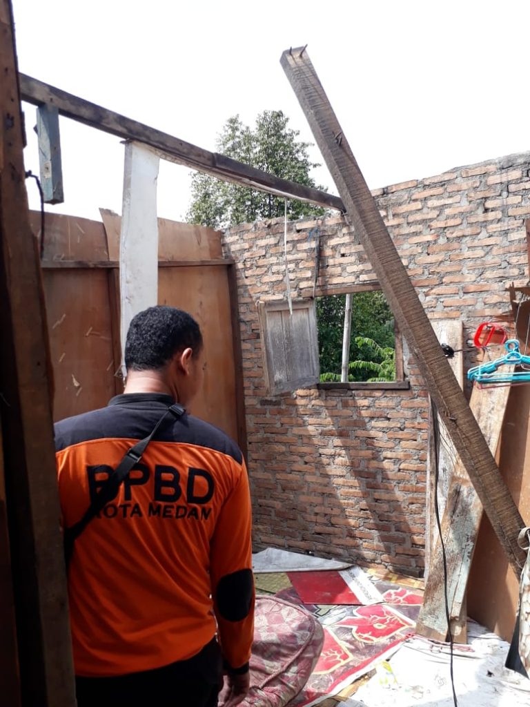 Mendapat laporan warga petugas Bpbd Medan langsung ke lokasi dan melihat objek objek yang terdampak angin puting biliung di Kecamatan Medan Tembung, 21 Juni 2019.