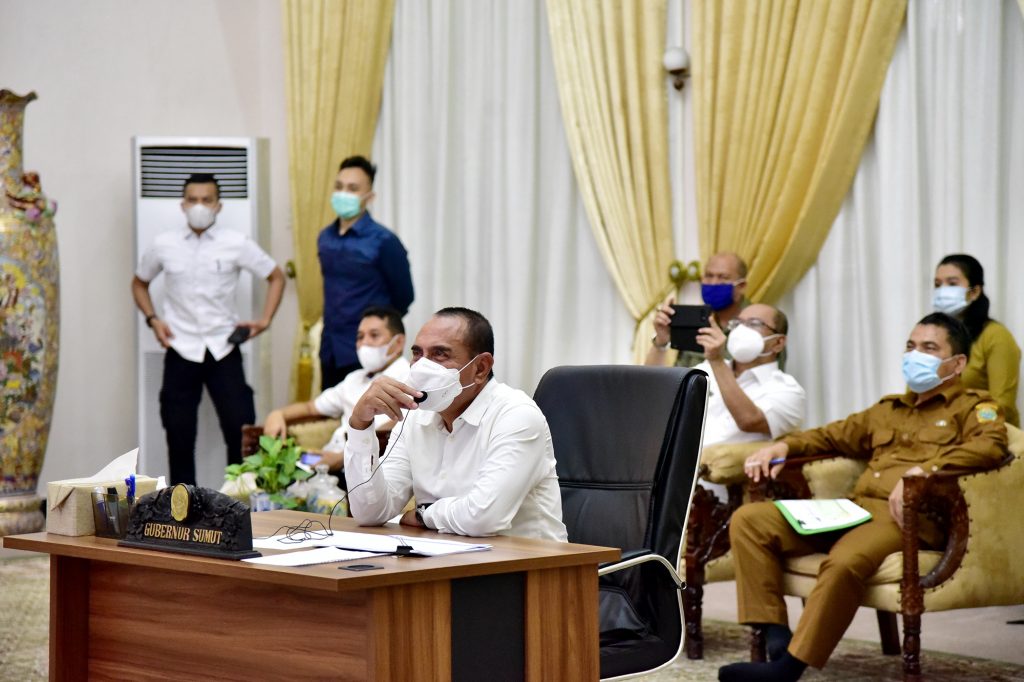 Hal itu disampaikan Gubernur Sumut Edy Rahmayadi saat memimpin rapat koordinasi penanganan Covid-19 dengan pemerintah kabupaten/kota secara virtual di Pendopo Rumah Dinas Gubernur, Jalan Jenderal Sudirman Nomor 41 Medan, Selasa (13/10). Turut hadir Kadis Kominfo Sumut Irman Oemar, Kadis Kesehatan Sumut Alwi Mujahit dan Sekretaris Satuan Tugas (Satgas) Penanganan Covid-19 Sumut Arsyad Lubis.
