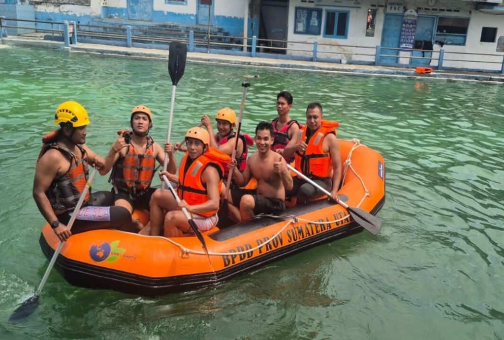 Kegiatan dibuka dengan briefing teknis dari tim BPBD Sumatera Utara, yang menyampaikan prosedur standar penanganan banjir sesuai pedoman nasional. Peserta kemudian mempraktikkan skenario banjir besar dengan menggunakan peralatan simulasi seperti boneka korban, pelampung, dan perahu karet yang disediakan di kolam renang.