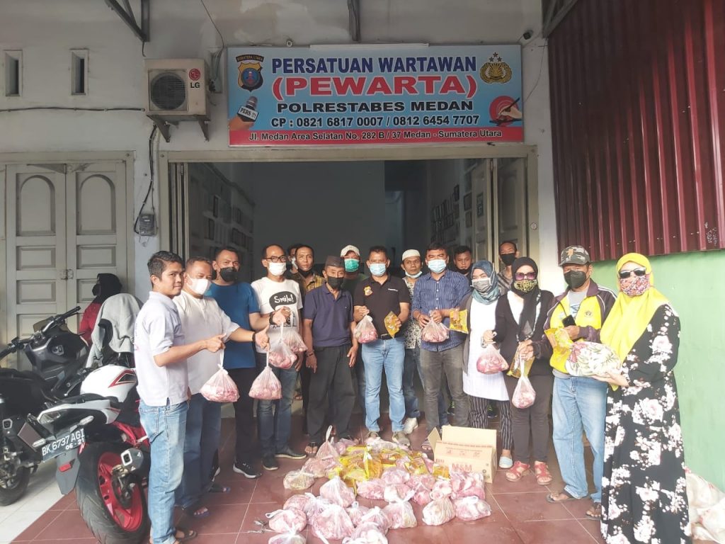Medan – Bnews.id :Wujud kebersamaan dalam merayakan Idul Adha 1442 H, Ketua Pewarta Polrestabes Medan Chairum Lubis SH, membagikan daging kurban kepada 80 wartawan, di Gedung Kantor Pewarta Jalan Medan Area Selatan, Kota Medan, Selasa (20/07/2021).