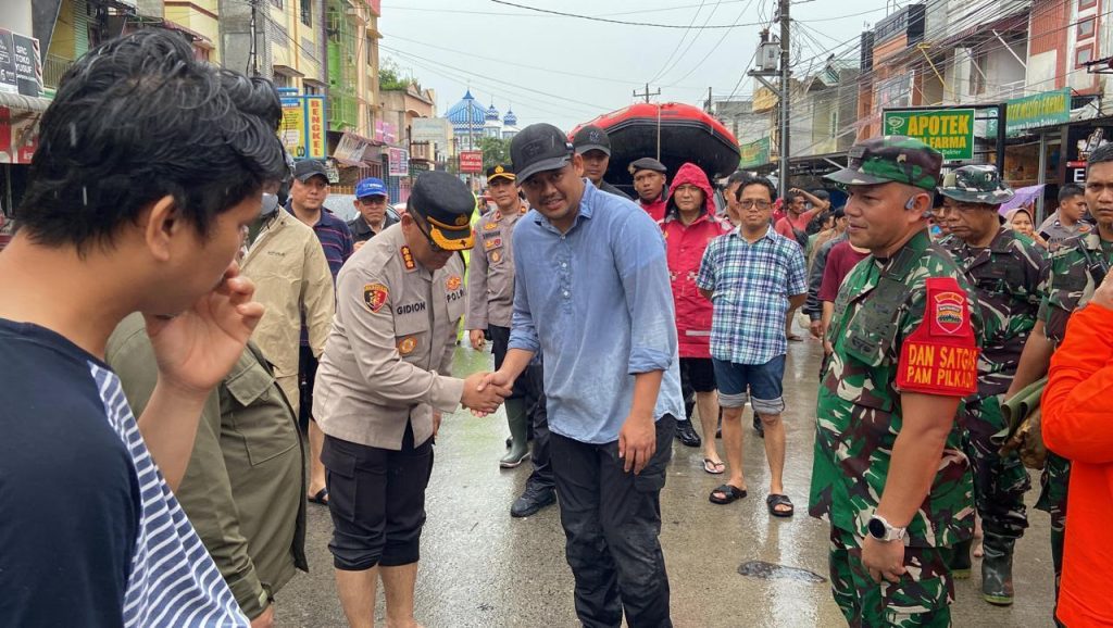 BNEWS.ID, Medan – Tingginya intensitas hujan yang menguyur Kota Medan membuat Komandan Kodim (Dandim) 0201/Medan Kolonel Inf M. Radhi Rusin S.I.P, bersama Kapolrestabes Medan, Kombes Pol Gidion Arif Setyawan, S.I.K., S.H., M.Hum, Forkopimda, meninjau langsung beberapa titik lokasi terdampak banjir di wilayah Kota Medan.