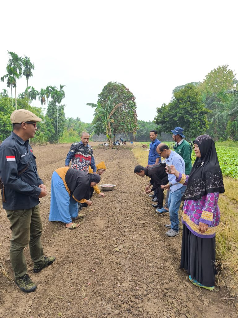 Sofyan Pasaribu di dampinggi Kabid Tanaman Pangan dan Hortikultura Kota Binjai, Zufan dan turut hadir Ketua PWI Kota Binjai, Arma Delisa Budi, Koordinator PPL Kecamatan Binjai Utara PPL WKPP Jati Utomo dan beberapa ketua kelompok tani langsung ikut menam umbi bawang merah di atas lahan yang telah di siapkan.