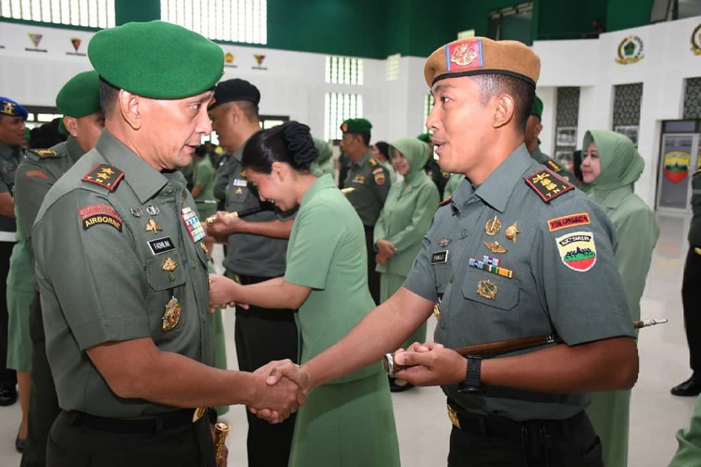Tampak terlihat Pangdam I/BB Mayjend M. Sabrar Fadhillah menyalami Danyon Arhanud 11/WBY pada acara Kenaikan pangkat 1 tingkat lebih tinggi dari mayor Arh menjadi Letkol Arh Tamaji S.Sos, M.I. Pol di Makodam I/BB Jl. Gatot Subrito Medan, 1 Oktober 2019.