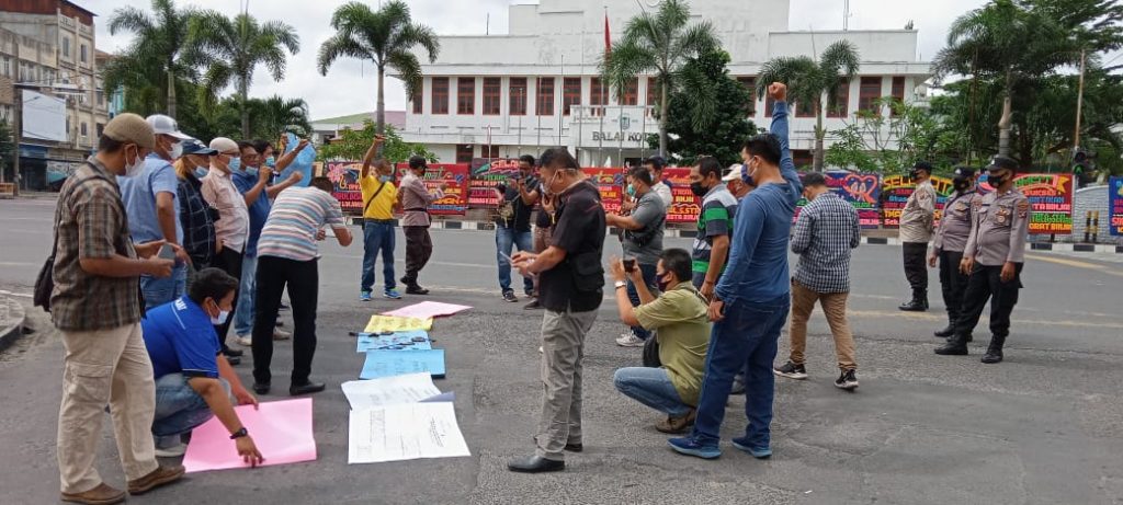 Dengan mengenakan alat pengeras suara (Toa) sembari membentangkan Karton, sang orator dalam seruan aksi yang mengusung tema “Jangan Rampas Kebebasan Pers” terus menyuarakan tuntutannya.