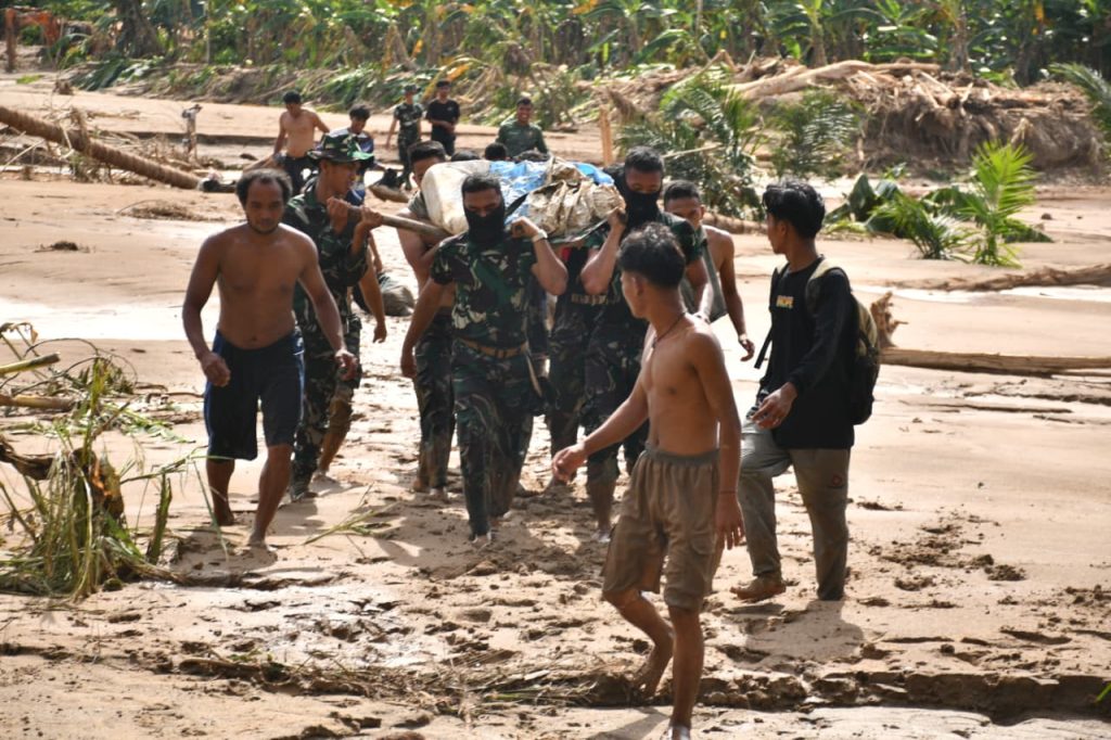 Jenazah korban ditemukan tersangkut di tumpukan potongan kayu yang hanyut terbawa arus banjir. Proses evakuasi berlangsung dalam kondisi medan berat, dengan banyaknya material kayu dan lumpur yang menutup akses. Prajurit TNI bersama warga setempat bergotong-royong mengevakuasi jenazah ke lokasi aman sebelum diserahkan kepada keluarga.