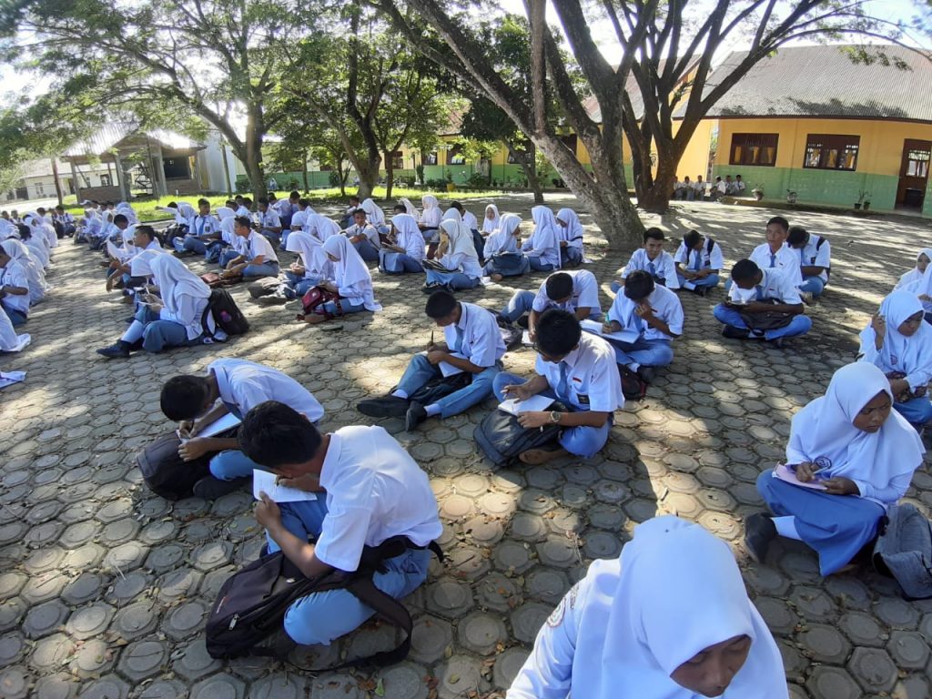 Aceh Tamiang – Tampak sejumlah siswa mengikuti lomba menulis puisi di SMA N 4 Kejuruan Muda, Aceh Tamiang, 25 November 2019. Lomba menulis puisi ini sebagai moment dalam peringati hari guru. Foto / Satria Yolanda