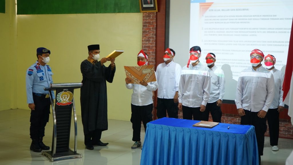 Kegiatan kemudian dilanjutkan pada acara inti, yaitu Pembacaan Ikrar Setia Kepada NKRI, Penandatanganan Pernyataan Setia kepada NKRI, dan Prosesi Penghormatan serta Penciuman Bendera Merah Putih oleh 08 (delapan) orang Narapidana Tindak Pidana Terorisme.