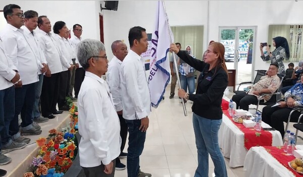 Usai melaksanakan prosesi penyerahan bendera pataka, Ketua SMSI Sumut Erris J Napitupulu membacakan kata-kata pelantikan sekaligus penyerahan SK dan AD/ART organisasi didampingi Sekretaris Ariadi dan Ketua Bidang Organisasi dan Daerah Benny Pasaribu.