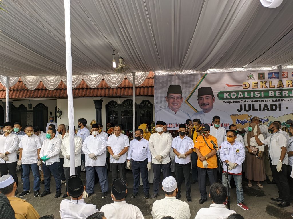 Binjai – Tim relawan dan seluruh partisipan pendukung Berjma’ah baik Bersahaja, menyatakan deklarasi pasangan bakal calon Wali Kota Binjai H. Juliadi, SPd. MM, dan bakal calon Wakil Wali Kota Binjai Drs. H. Amir Hamzah, MAP, sebelum berangkat ke Komisi Pemilihan Umum (KPU) Kota Binjai, Minggu (06/09/2020) Pagi.