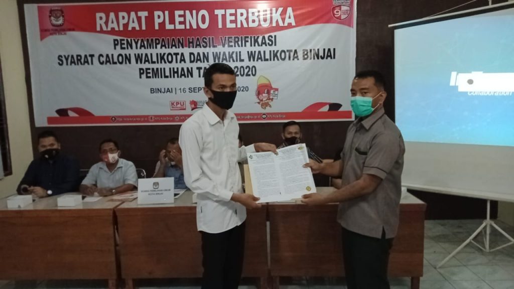 Hasil pemeriksa Kesehatan jasmani, Rohani dan Bebas Penyalahgunaan Narkotika bakal calon kepala daerah dan wakil kepala daerah diserahkan KPU Kota Binjai kepada Laison Officer (petugas penghubung) tim Lisa-Sapta, Irfan Arya Satria, Rabu (16/9/2020).